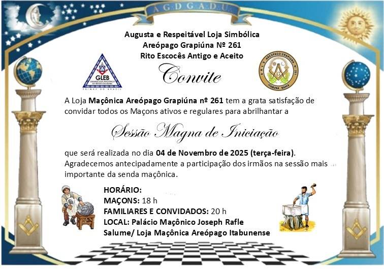 Local: Palácio Maçônico Joseph Rafle Salume/Aug.·. e Res.·. Loj.·. Simb.·. Areópago Itabunense nº 9, R.·. E.·. A.·. A.·. /G.·. L.·. E.·. B.·. , Or.·. de Itabuna/BA