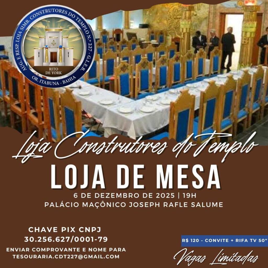 Local: Palácio Joseph Rafle Salume/Aug.·. Resp.·. Loj.·. Simb.·. Areópago Itabunense/R.·.E.·.A.·.A.·./G.·.L.·.E.·.B.·.