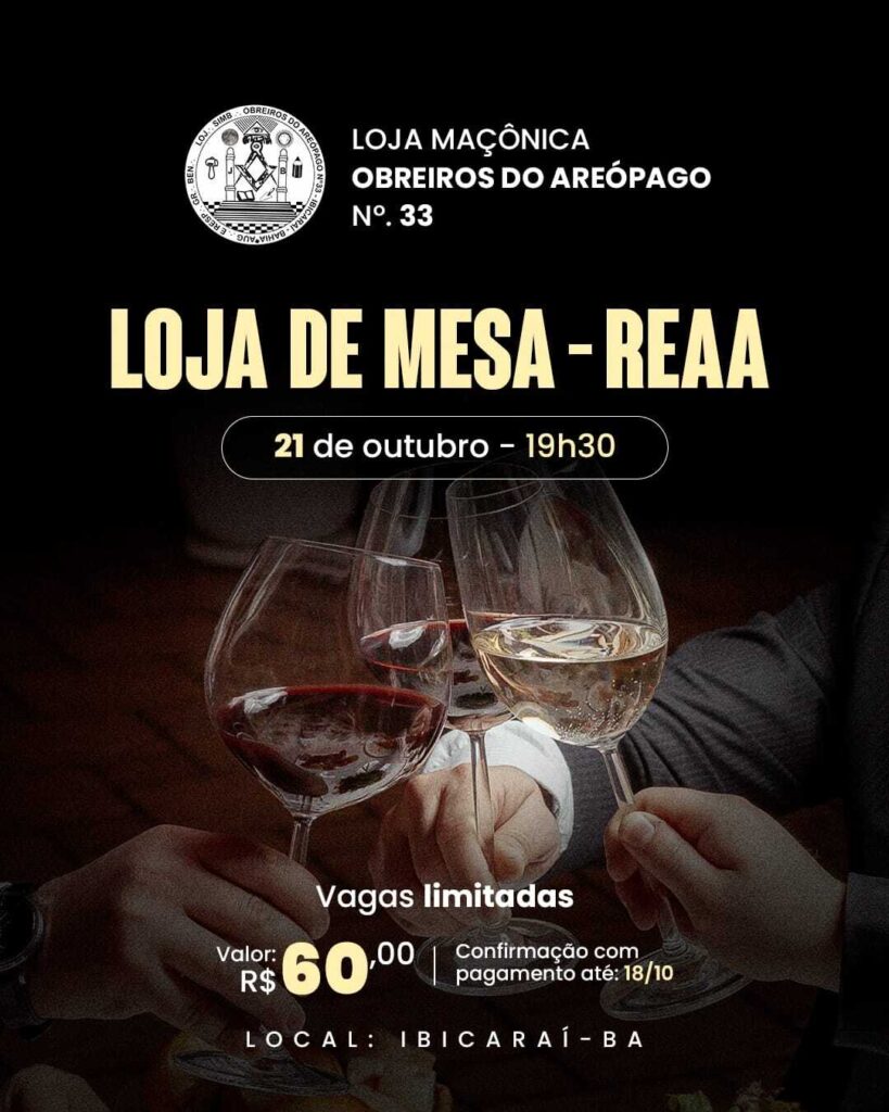 Local: Templo da Aug.·. e Res.·. Loj.·. Simb.·. Obreiros da Areópago nº 33, R.·. E.·. A.·. A.·. /G.·. L.·. E.·. B.·. , Or.·. de Ibicaraí – BA