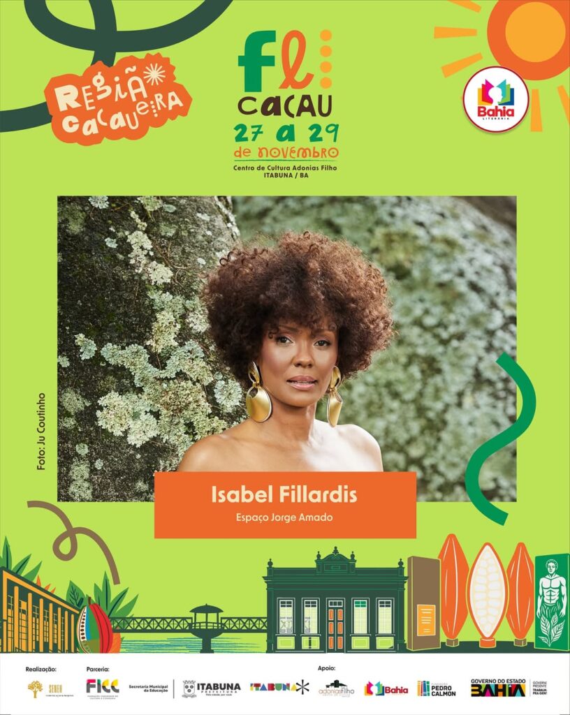 No sábado (29), às 17h, o Espaço Jorge Amado também receberá a atriz, cantora, apresentadora e ativista social Isabel Fillardis. “Terei o prazer de estar na primeira Flicacau para falarmos de assuntos urgentes e importantes. Em volta, um ambiente literário cheio de inspirações e, para mim, em especial, voltar a Itabuna depois de mais de 30 anos. Que alegria voltar assim”, escreveu a convidada em uma rede social. Na mesa, Isabel terá a companhia do professor e produtor Tcharly Briglia e da escritora e professora Luciany Aparecida.