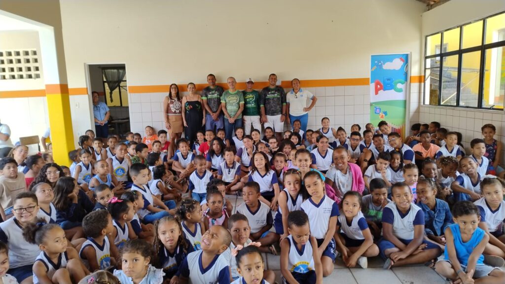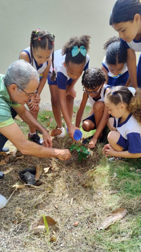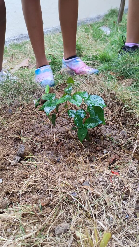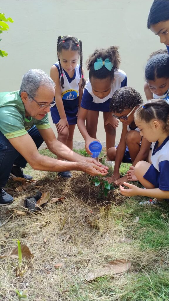 Após a palestra, um aluno de cada série foi escolhido para realizar o plantio de uma árvore frutífera na área externa da escola. Esses estudantes foram designados como guardiões da nova muda, assumindo a responsabilidade de cuidar da nova plantinha.