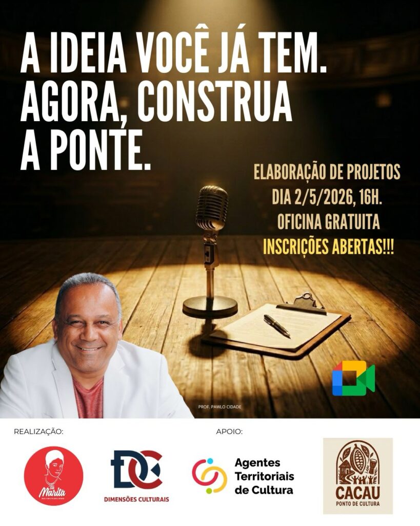 Muitas vezes o desejo de escrever um projeto esbarra na burocracia e no planejamento técnico. Mas para romper essa barreira, a Comunidade Tia Marita, em uma ação conjunta com a Dimensões Culturais, promove no próximo dia 2 de maio de 2026, às 16h, a oficina "A Ponte Entre a Ideia e o Palco".