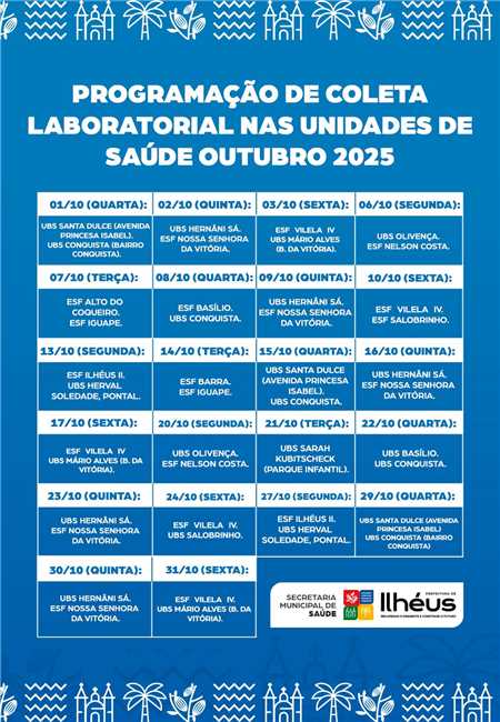 A Prefeitura de Ilhéus, por meio da Secretaria Municipal de Saúde, através da Diretoria de Atenção Básica, anunciou a ampliação do serviço de coleta de exames laboratoriais nas unidades de saúde do município. A medida, que teve início em setembro de forma piloto, contemplava inicialmente apenas sextas-feiras em duas unidades. Agora, a partir de outubro, a população passa a contar com coletas realizadas de segunda a sexta-feira, em diferentes dias da semana, de acordo com a organização de cada unidade.