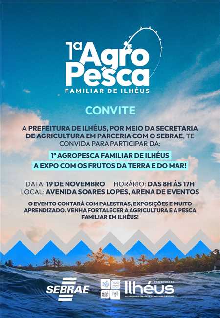 A Prefeitura de Ilhéus, por meio da Secretaria de Agricultura e Pesca, em parceria com o Sebrae, realiza a 1ª AgroPesca Familiar de Ilhéus, no dia 19 de novembro, das 8h às 17h, na Avenida Soares Lopes, na Arena de Eventos. A exposição vai destacar o potencial produtivo do município, reunindo os frutos da terra e do mar em um grande encontro de aprendizado, troca de experiências e valorização do trabalho local.