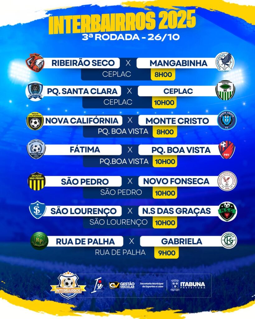 A Prefeitura de Itabuna, por meio da Secretaria de Esportes e Lazer, divulgou a tabela de jogos da 3ª rodada do 24º Campeonato Interbairros de Futebol de Itabuna que acontece no domingo, dia 26, a partir das 8 horas. O evento é patrocinado pelas empresas Gestão Veicular e Ise Japonês & Grelhados, vencedores da Chamada Pública.