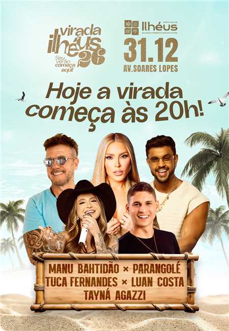A última noite da Virada Ilhéus 2026, réveillon oficial do município promovido pela Prefeitura de Ilhéus, terá início a partir das 20h, nesta quarta-feira (31), na arena de eventos montada na Avenida Soares Lopes. A programação de encerramento contará com shows de Manu Bahtidão, Parangolé, Tuca Fernandes, Luan Costa e Tayná Agazzi, garantindo uma noite de muita música e celebração.